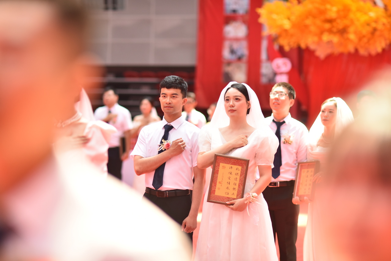 6月28日,“天山缘起 疆爱永恒”情牵中石大集体婚礼在克拉玛依校区红山湖体育馆举行,55对在新疆这片热土建功立业并喜结良缘的伉俪重返母校,共同举行结婚典礼。