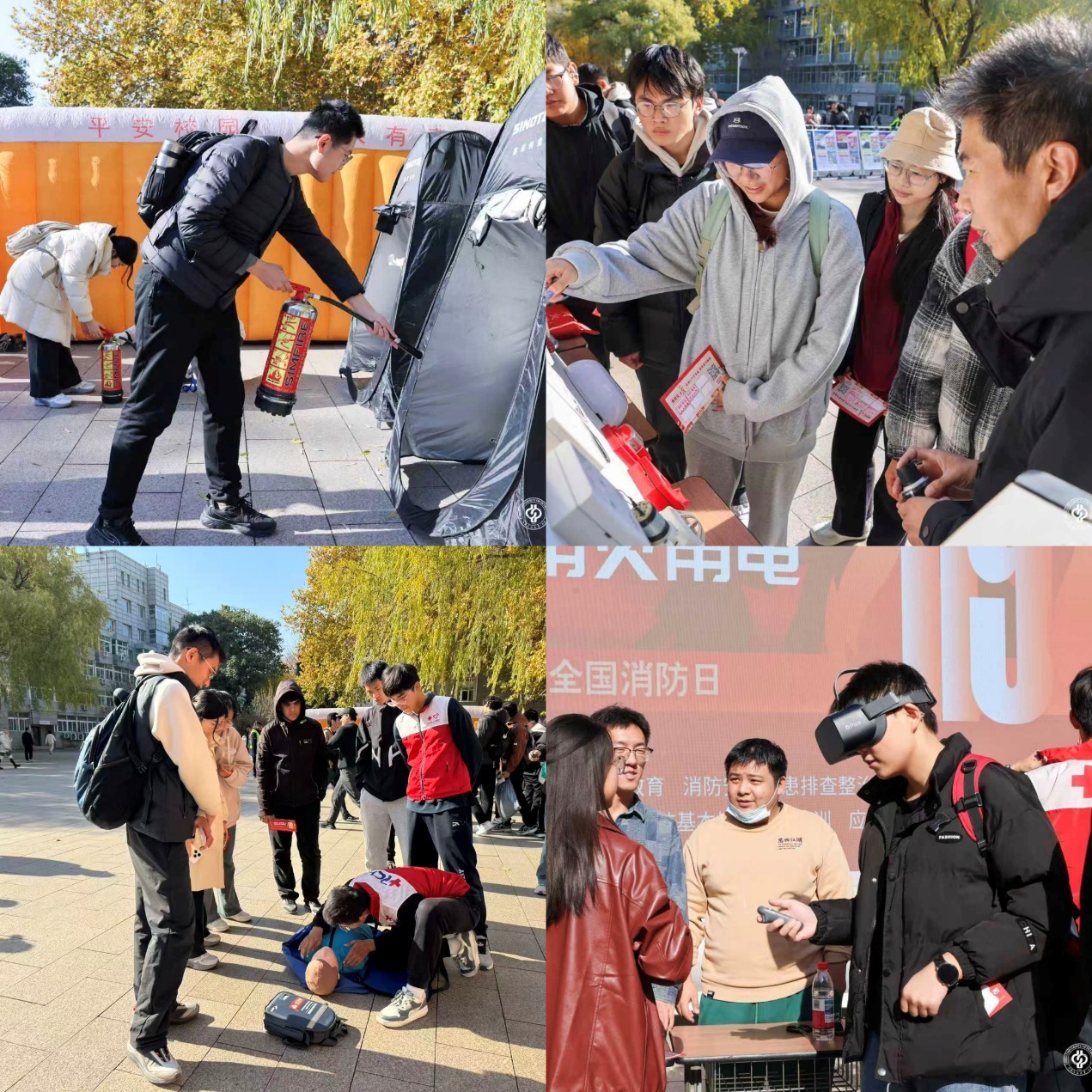 宣传引导多维覆盖,营造浓厚安全氛围。活动期间,学校通过在校园内张贴海报、LED屏滚动播放标语、布置专题展板、利用“平安石大”微信公众号推送科普知识与活动动态等多种形式,构建了立体化宣传网络。11月14日,在北校园南广场举办的“119”主题宣传咨询日暨消防体验活动吸引了300余名师生参与。该活动设置了VR体验、电子灭火器灭火、模拟烟雾逃生、结绳体验、心肺复苏5个特色主题展区,让师生在互动体验中深刻认识消防、关注消防、参与消防。