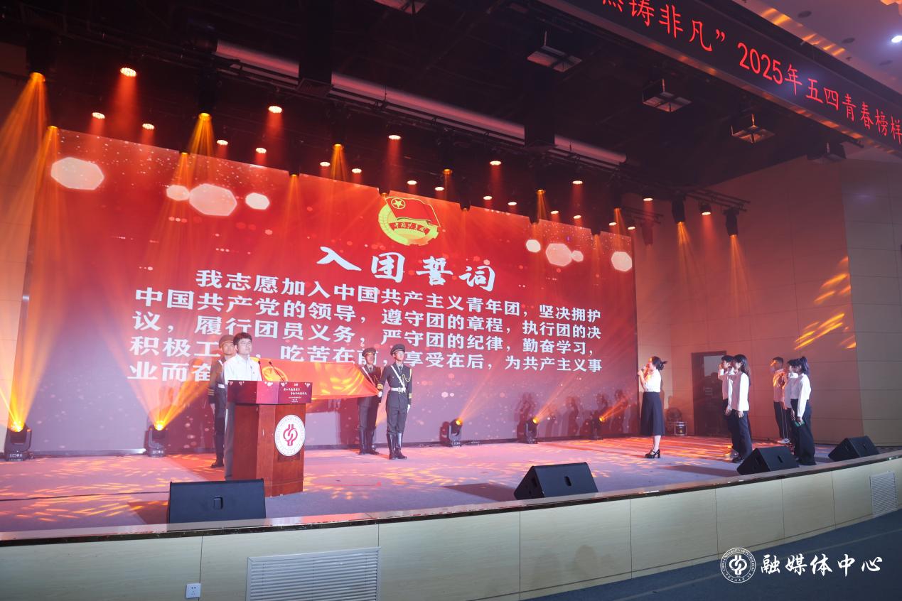 会前,学校党委副书记、纪委书记韩克飞为新发展团员代表佩戴团徽、颁发团员证,校团委书记周学智主持入团仪式,人工智能学院团委书记代莉莎带领新发展团员进行入团宣誓。