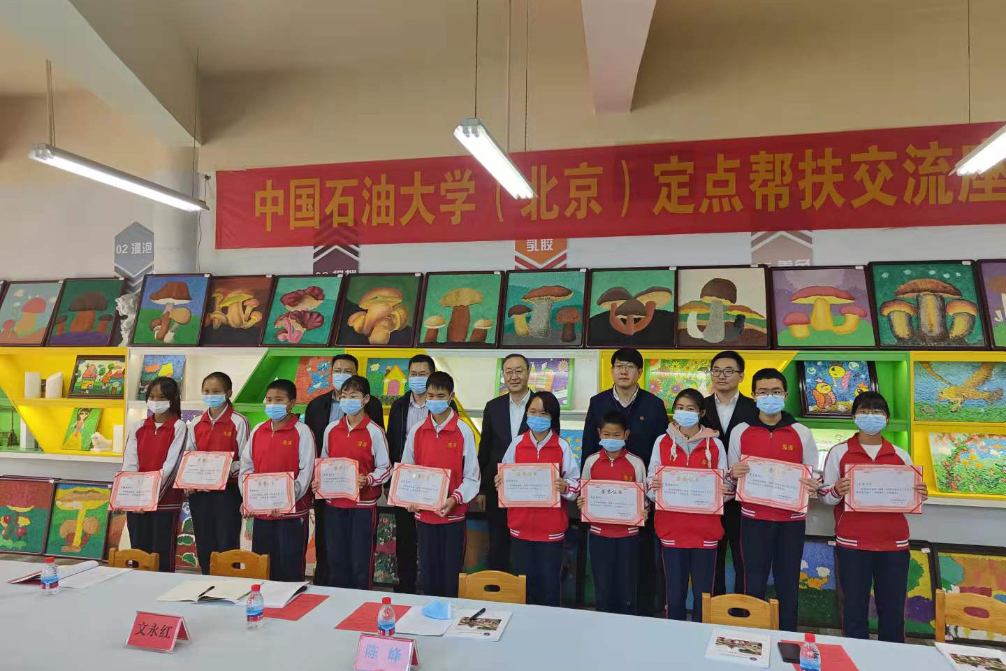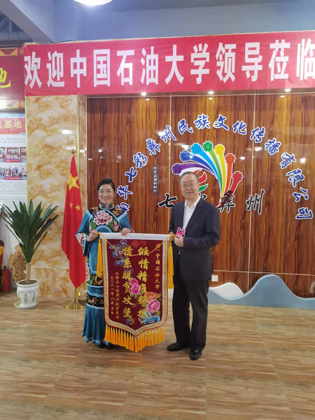 座谈会后,陈峰一行赴南华县思源实验学校、七彩彝州刺绣加工厂实地考察。在思源实验学校,陈峰听取了县教体局、学校负责人、支教学生的工作汇报,并为石大励志奖学金获奖学生代表颁发证书。他表示,中石大将发挥教育帮扶力量的优势,加大对南华县基础教育的支持力度,并勉励支教学生发扬中石大精神,实事求是,艰苦奋斗,在实践中长才干、增本领,不负时代,不负韶华。