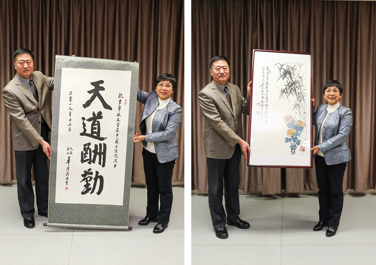 90岁高龄的华泽澎教授和82岁的余世诚教授,得悉三位校友当选院士的喜讯后非常高兴,提笔泼墨为三位院士分别题字作画。山红红向三位院士赠送了书画作品。