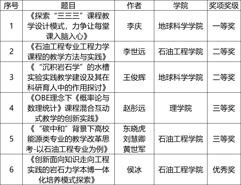 青年教师教学基本功比赛是广大青年教师糅杂理念、切磋水平、展示风采的重要载体,是助推青年教师夯实基础、提升水平、更新理念的响亮品牌。本届青年教师教学基本功比赛论文比赛面向全市高校青年教师征集有关教学教法的论文,共收到参赛论文405篇,经评委会评审、组委会复核,最终111篇论文获奖。中石大22名青年教师共提交18篇论文参加比赛。