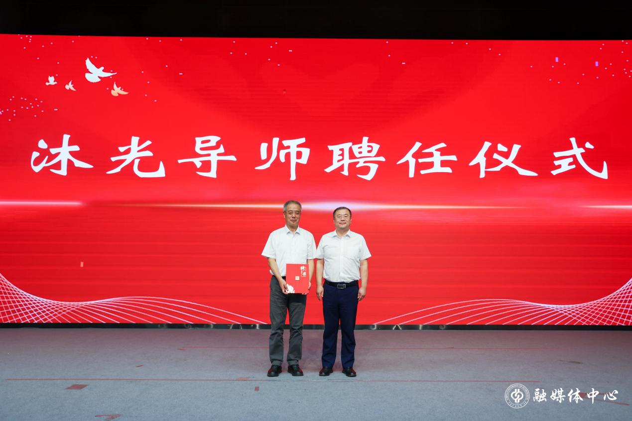 黄磊为许进颁发学校沐光导师聘书。研究生新生代表为许进献上鲜花,表达感谢和敬意。
