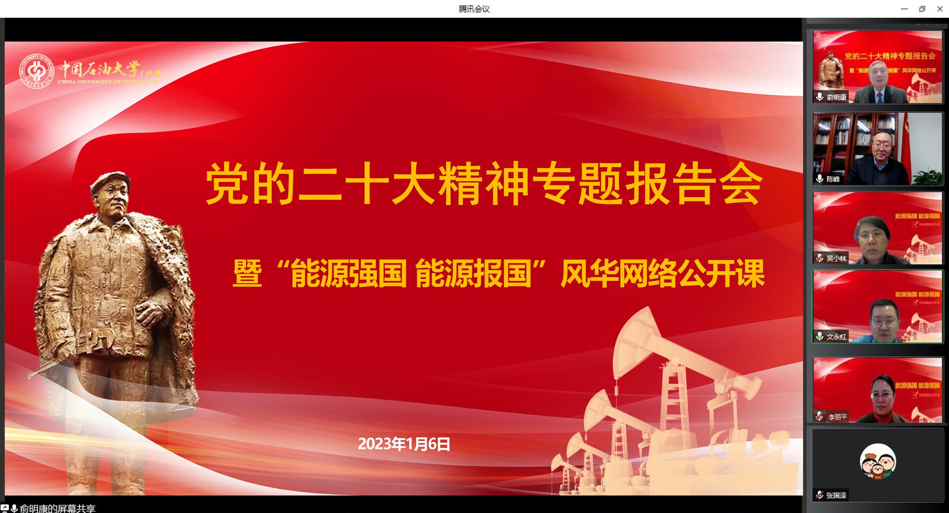为深入学习贯彻党的二十大精神,传承弘扬中国共产党人精神谱系,1月6日下午,中国石油大学举办学习贯彻党的二十大精神专题报告会暨“能源强国 能源报国”风华网络公开课,中国石化原思想政治工作部副主任俞明康受邀作了题为“石油战线始终是共和国改革发展的一面旗帜,要继续举好这面旗帜——贯彻党的二十大精神,弘扬大庆精神铁人精神”的专题报告。