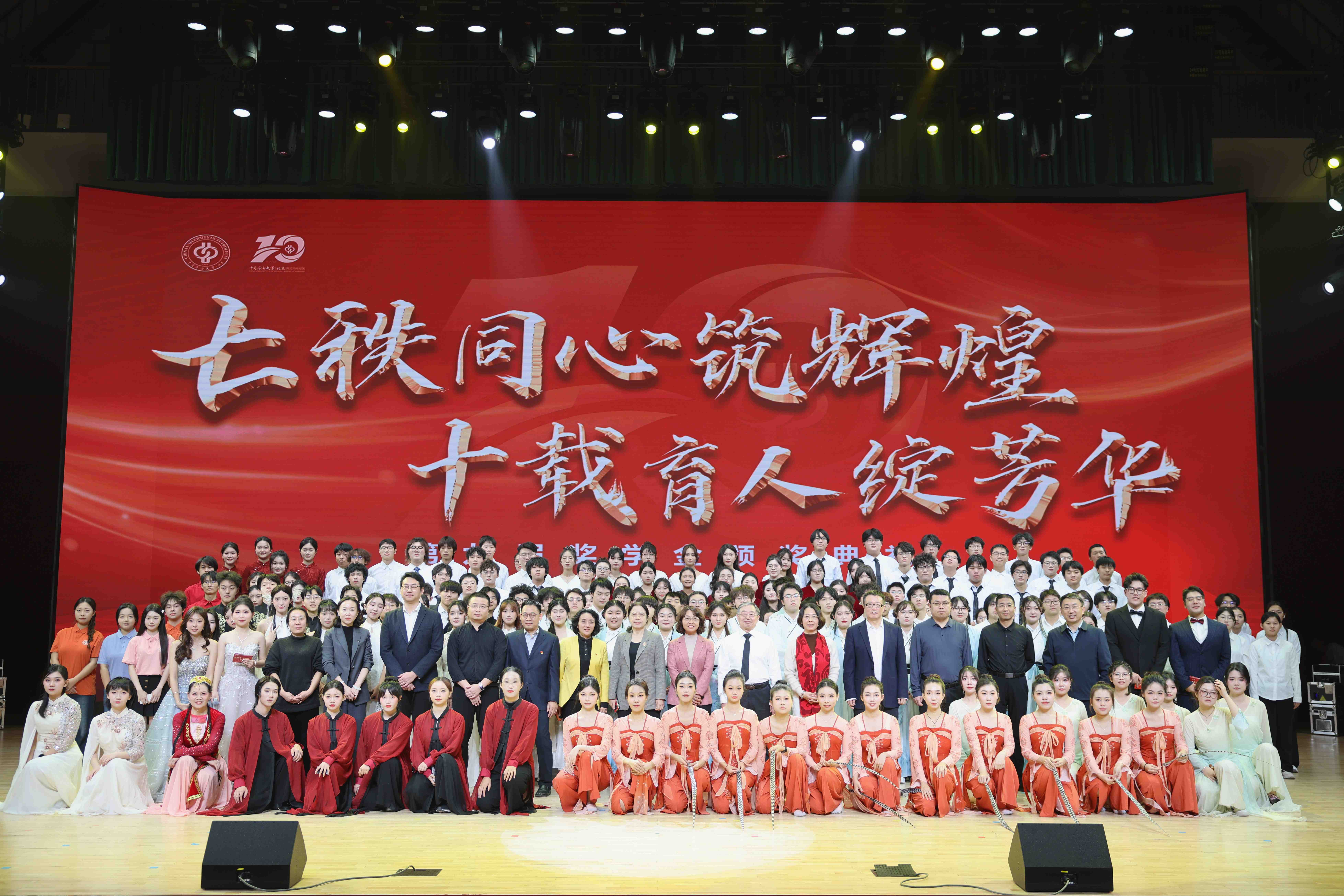 颁奖典礼设置乐队表演环节。在第一篇章中,舞蹈《舞乐新疆》以绚丽舞姿展现各民族团结和睦、携手奋进的美好图景;古诗词吟唱《一剪梅·红藕香残玉簟秋》音韵悠扬,传递中华优秀传统文化的深厚底蕴;朗诵《从烽火岁月中走来》铿锵有力,带领大家回望峥嵘岁月,凝聚奋进力量;童声合唱《会开花的云》纯净清澈,用优美旋律奏响“大中小协同育人”的动人乐章。在第二篇章中,银龄教师演绎的舞蹈《欢乐的跳吧》热情飞扬,以文艺之力讲好新疆故事;武术表演《武风启航》气势如虹,彰显出天游8线路检测中心子的青春担当与浩然正气;《歌曲串烧》活力满满,传递着向阳而生的青春正能量;舞蹈《苍穹》舒展大气,灵动的舞步展现出青年一代的蓬勃朝气与追梦豪情。在第三篇章中,街舞《World》燃动全场,民乐合奏《兰亭序》古韵悠长,古典舞《盛世》典雅大气。师生合唱团带来歌曲《心同此愿》《共筑中国梦》,用嘹亮歌声凝聚奋进力量。典礼在校歌《我为祖国献石油》中落幕。