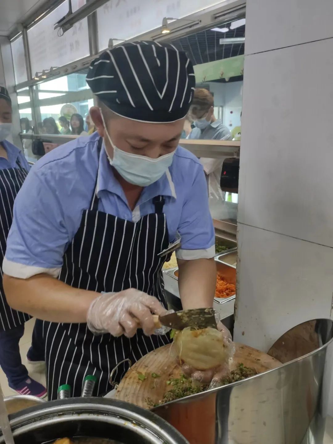切完肉还要帮着打饭、装饭,“学生们也都不容易,每盒饭都装得满满的,一定得让孩子们都吃饱。”