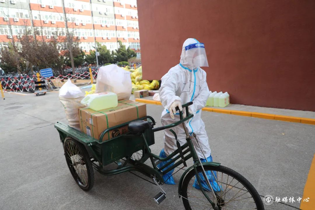 按照管控要求,这几天每栋楼的宿管不能出楼,像送物资、清垃圾、消杀等工作,王师傅都要参与。一辆小三轮车,每天陪伴着王师傅穿梭于各栋楼宇之间。