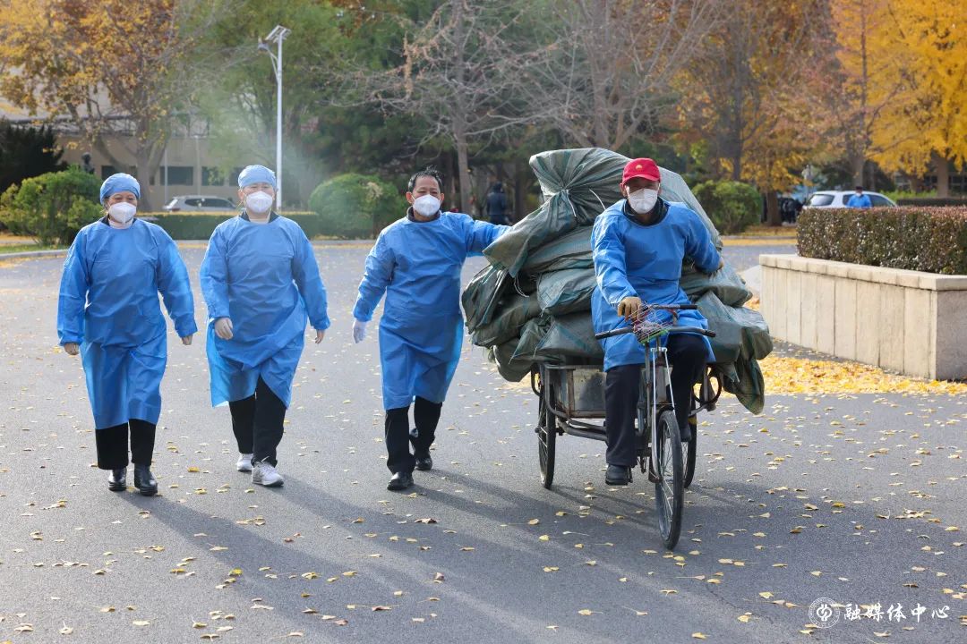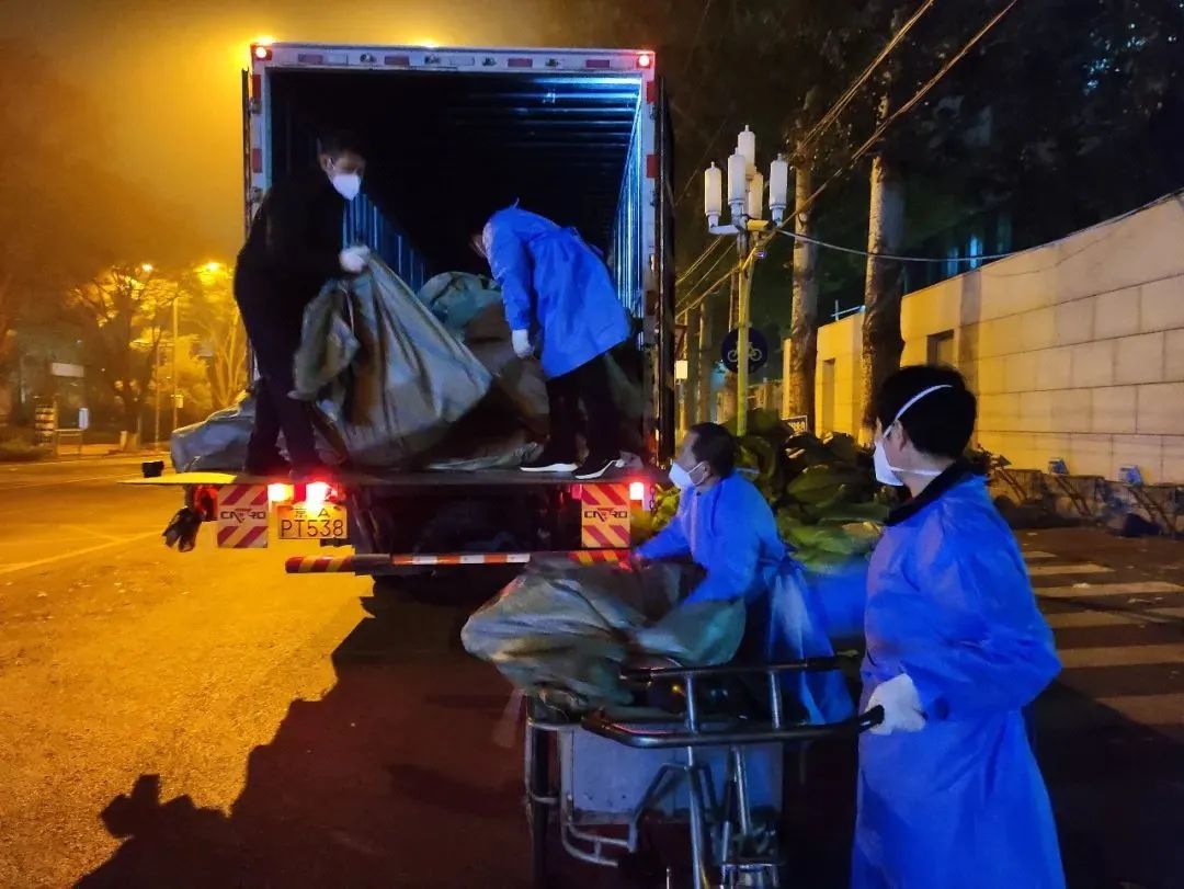 11月10日深夜12点至凌晨2点,公寓管理服务中心组织10多名员工卸运床上用品400多套,用仅有的4辆小三轮车,一趟一趟从东门搬运至体育馆。12日晚11点至凌晨2点,20多名员工搬运防疫物资,凌晨2点半至4点半,冒着大雨到东校园五教,搬卸学校新购置的400套备用床。他们都已不年轻,有的两鬓斑白,有的腰腿不好,但任务面前没有人退缩。他们每日清理公寓楼内涉疫垃圾,并用专业用具清运出楼、及时消毒。