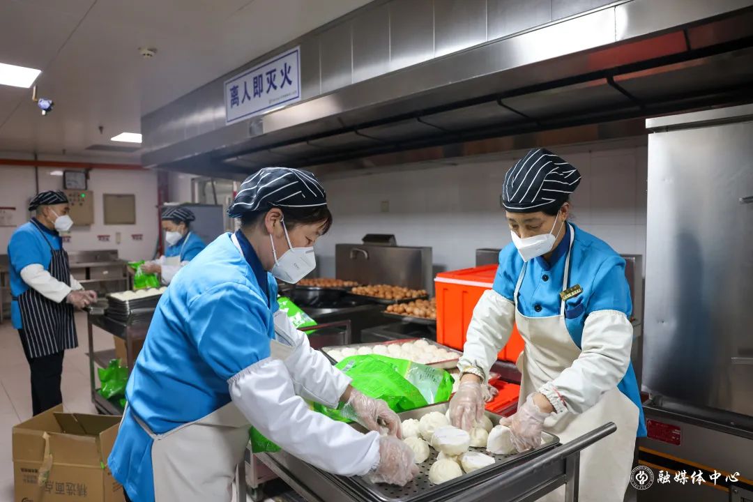 跟刘海涛一样的餐饮人员还有很多。面对巨大的供餐压力,餐饮师傅们常常通宵备餐。凌晨2点,就已起床接收原材料;凌晨3点,开始准备早餐包子的加工。天还未亮,就全员集结,开始打包早餐。灯火通明的食堂里,处处是餐饮人忙碌的身影。
