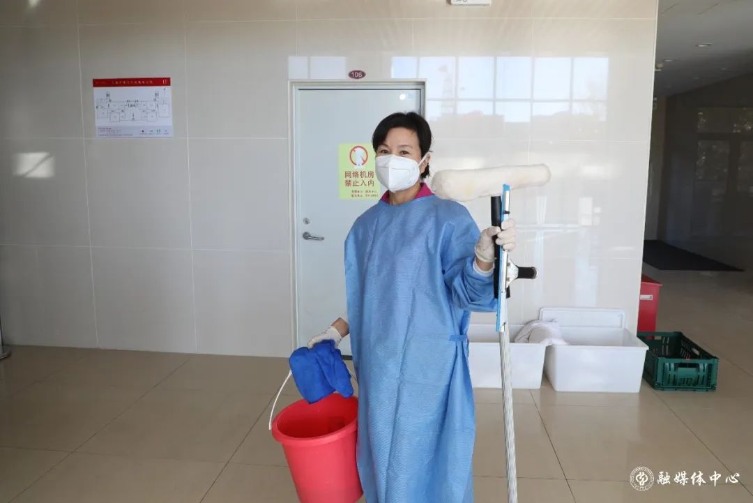 从事保洁消杀的岳建芳:“累肯定是累的,但做好本职工作是我义不容辞的责任。很多老师来到东校园后都住在教室里,每天我看到他们疲惫的样子也很心疼,大家都不容易,共渡难关!”