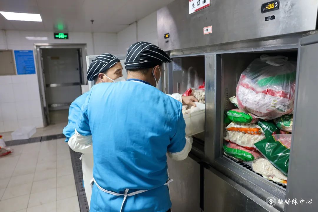 王子臣、齐宏春是第一食堂负责鲜肉加工的师傅,鸡、鸭、鱼、排骨、肉馅……每天早上不到5点就开始切肉,11月16日就切了70箱鸭腿、320斤肉。