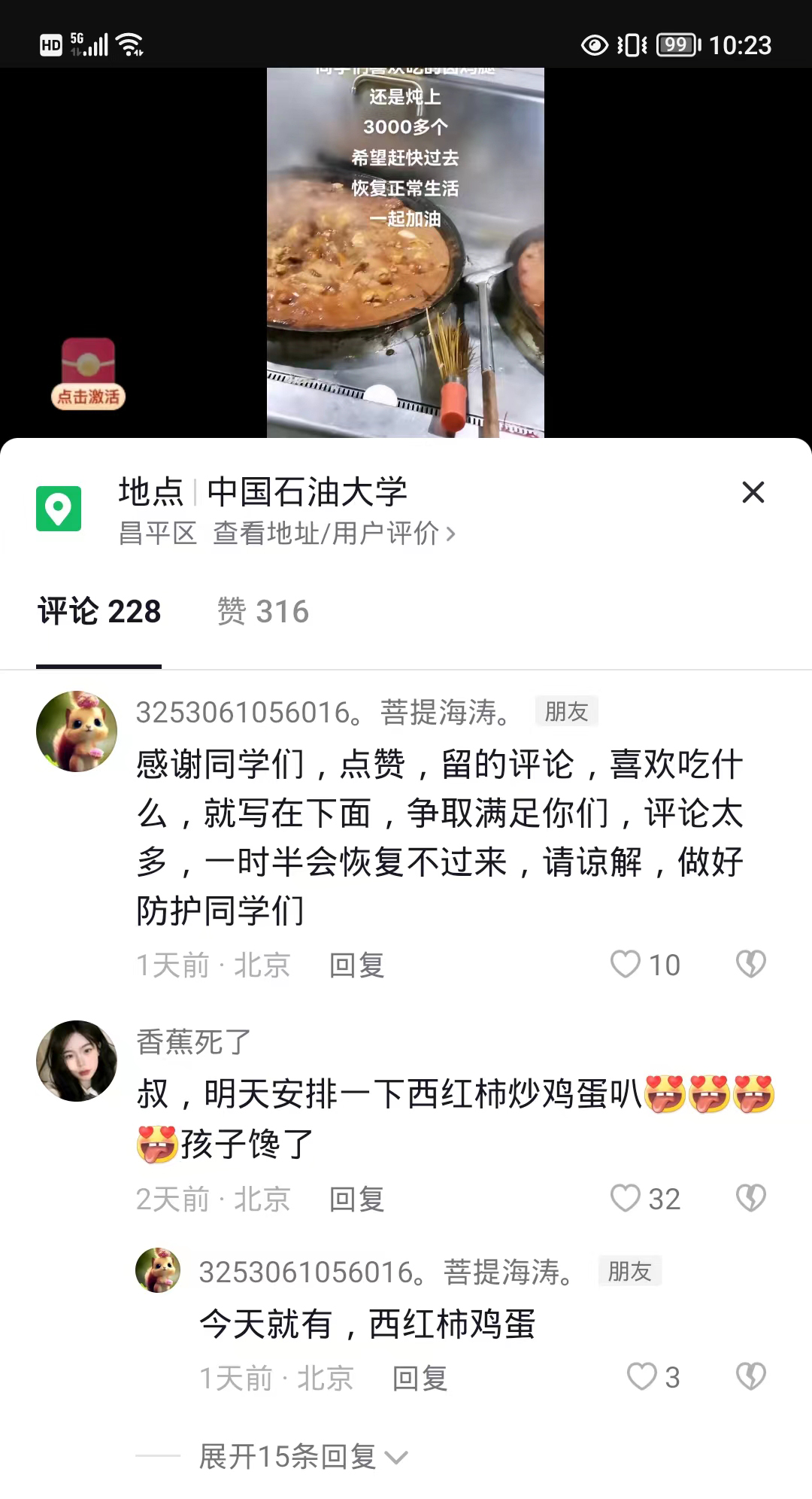 2018年,刘海涛来到中石大从事餐饮工作。自学校进入临时管控状态以来,同学们虽然分隔在各个宿舍区域,却不知从哪儿知道了“风声”,陆续不约而同地“聚到”刘海涛的短视频下留言互动,或“下单”点菜,或道声问候,或点赞致谢,或提建议想法……刘海涛也总是尽量满足学生们的需求。