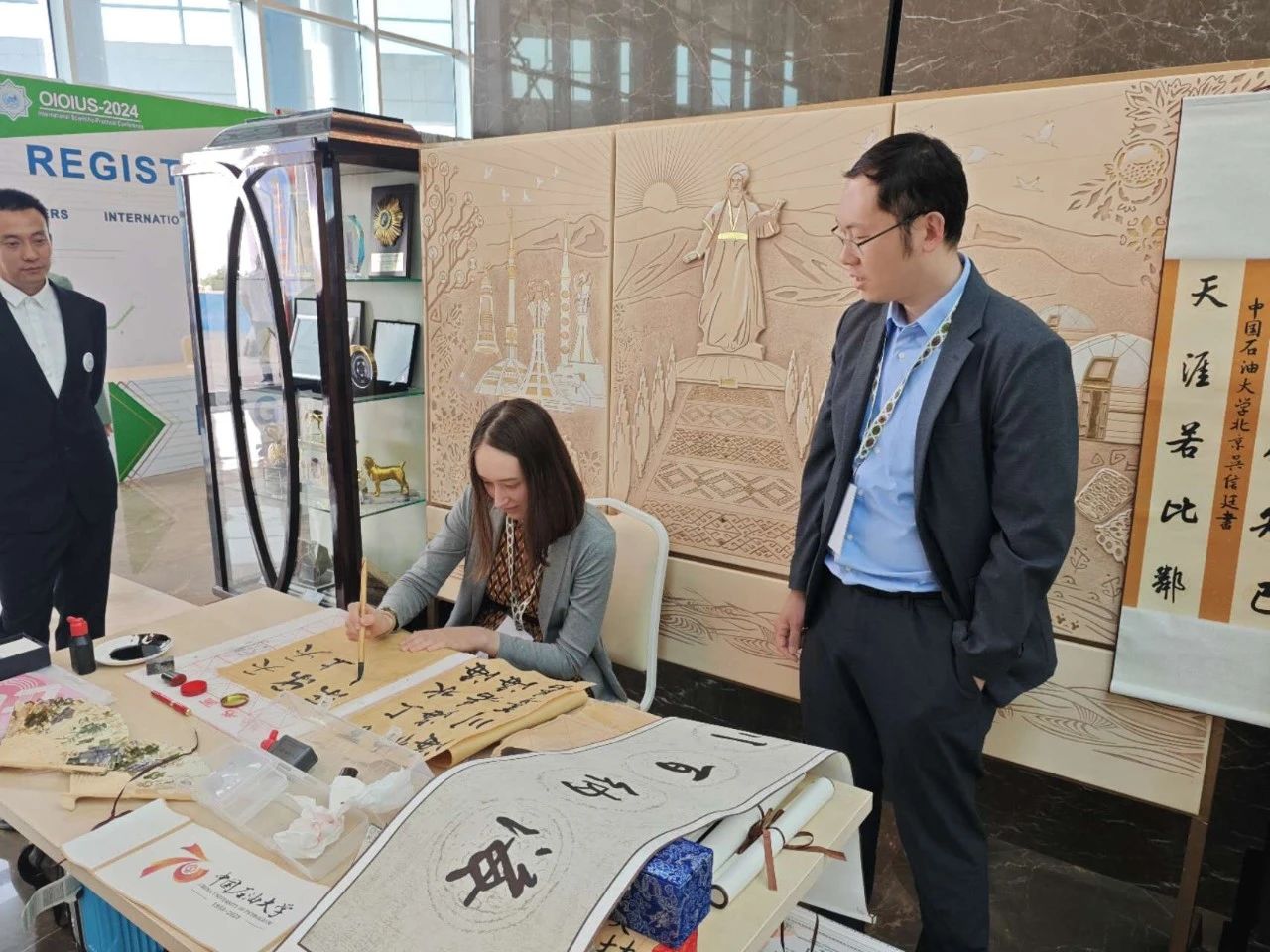 中国代表队还将一幅书法作品赠予亚格希格尔迪·卡卡耶夫国际石油天然气大学的校长,共同见证中土间的浓厚情谊。