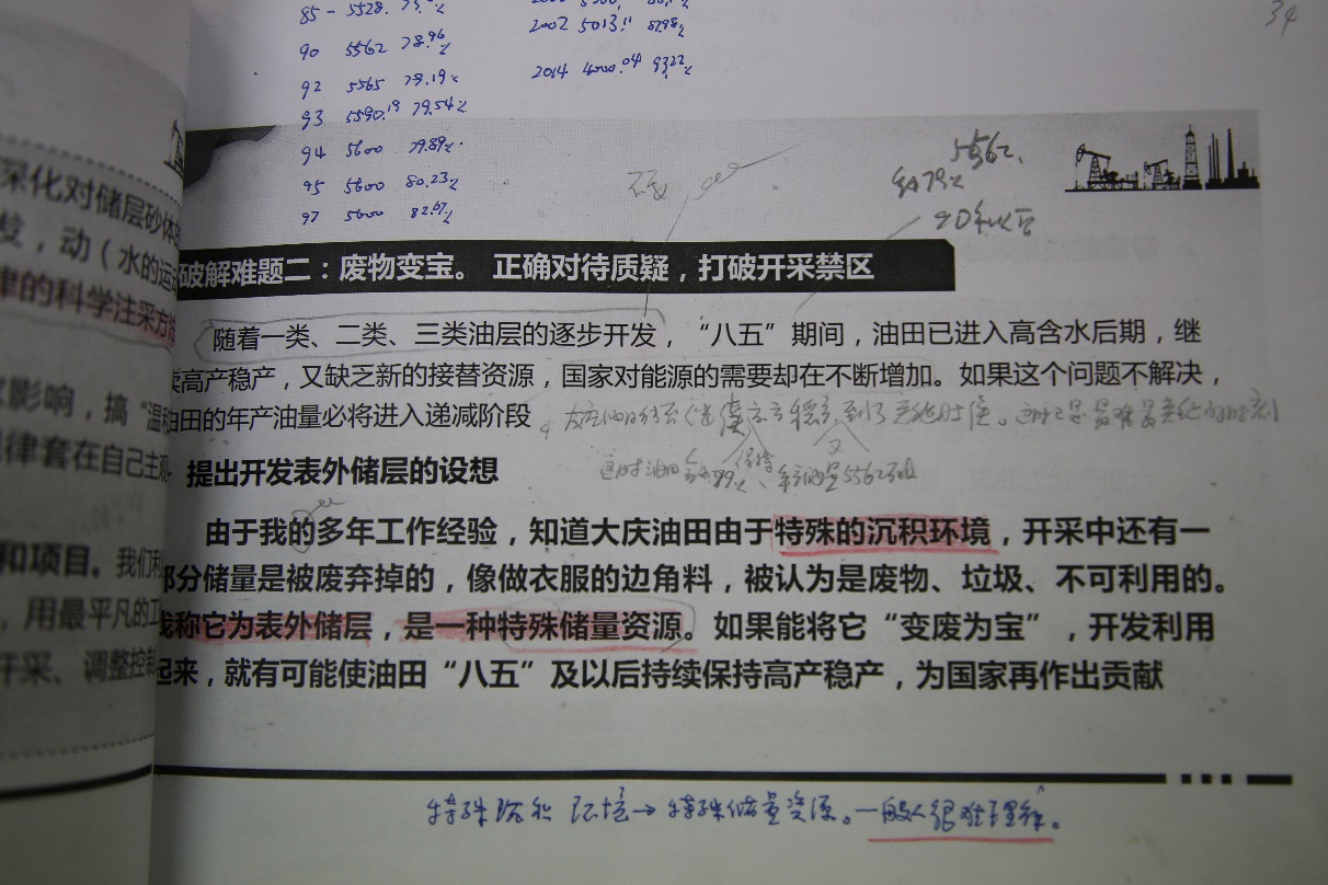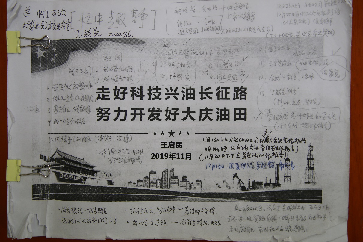 此次展览获得了一份与众不同的手稿。手稿很新又很旧。很新是因为上面写着时间2019年11月,很旧是因为已经磨损严重。在封面上的左上角,有一句启民校友手写的 “送中国石油大学(北京)校史馆”,并附有启民校友签名。翻开这本PPT讲稿,让人大吃一惊,几乎所有空白处,都有密密麻麻的手写批注,随机选取几个,都是金玉良言:“能吃小苦小难,造就普通平凡人;能吃大苦大难,造就突出人才;能吃特殊苦难,造就杰出人才。”“特殊沉积环境,特殊储量资源,一般人很难理解。”“痴——是对事业的爱。”这是启民校友在获得国家荣誉称号后,受邀给不同单位讲课时所用的PPT讲稿,他每次讲课前都会再次精心准备,加上自己新的思考和感悟,反复翻阅,手稿就变得很旧。这不同颜色,不同笔迹的一笔一划间,浸透了老人家几十年来的思想结晶和对后辈的殷切希望。手稿是老人家八十多年人生的高度概括和总结。这份手稿也是学校准备此次展览的最早“蓝本”,启民校友将其签名捐献给校史馆,成为本次展览背后的重要收获。