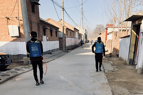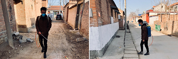 自疫情爆发以来,宋先晓主动报名参加村里的义务消毒工作。“我是党员,我先上!”他每天早晨八点半在村里小卖部门口集合,用喷雾桶稀释好84消毒液,然后走遍村里的大街小巷,认真地为村里道路杀菌消毒。在社区党总支书记的支持下,宋先晓等数十名青年自发成立了“爱心袖标服务队”,不仅挨家挨户地上门为村民发放消毒液、宣传防疫知识,还在村口执勤、管控人员流动,在村内巡逻消毒、劝散聚集群众,为村里防疫工作贡献自己的力量。