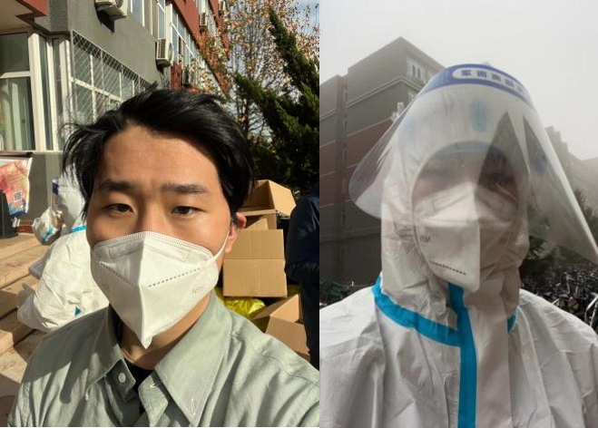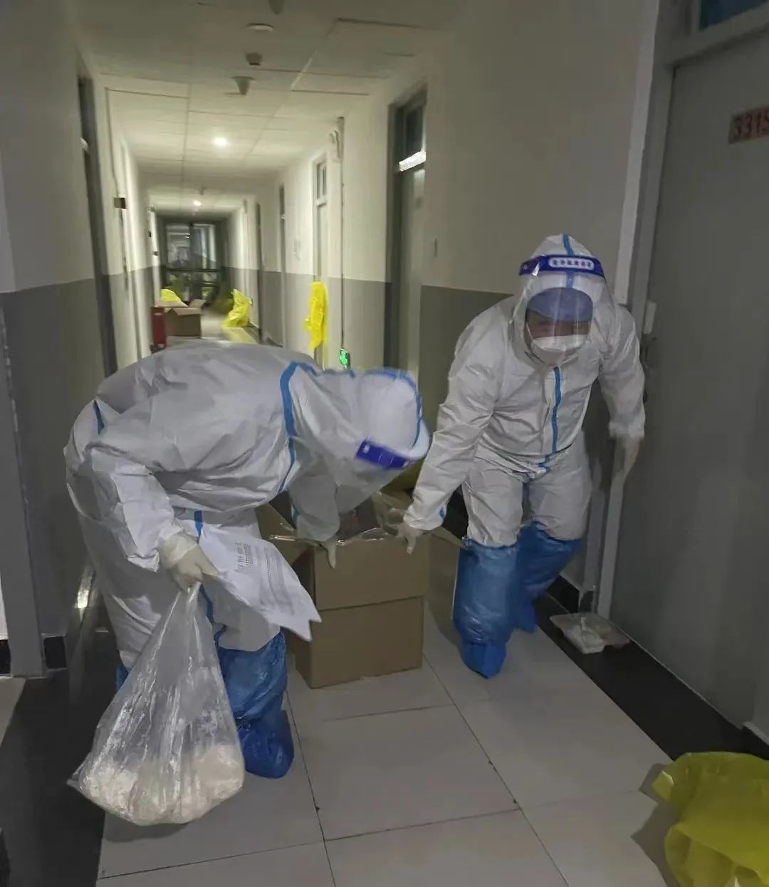 地球物理学院青年教师赵振聪也承担分餐任务。穿着厚重的防护服,他每天需要20多次爬上爬下6层楼。因为没有电梯运送餐食和物资,只能靠人拉肩扛手提,仅一层楼的送餐就要在半个小时到一个小时的时间里,敲门、弯腰、递餐80余次。终于轮到送餐员吃饭了,此时才发觉,手臂已经酸痛到握不住筷子。