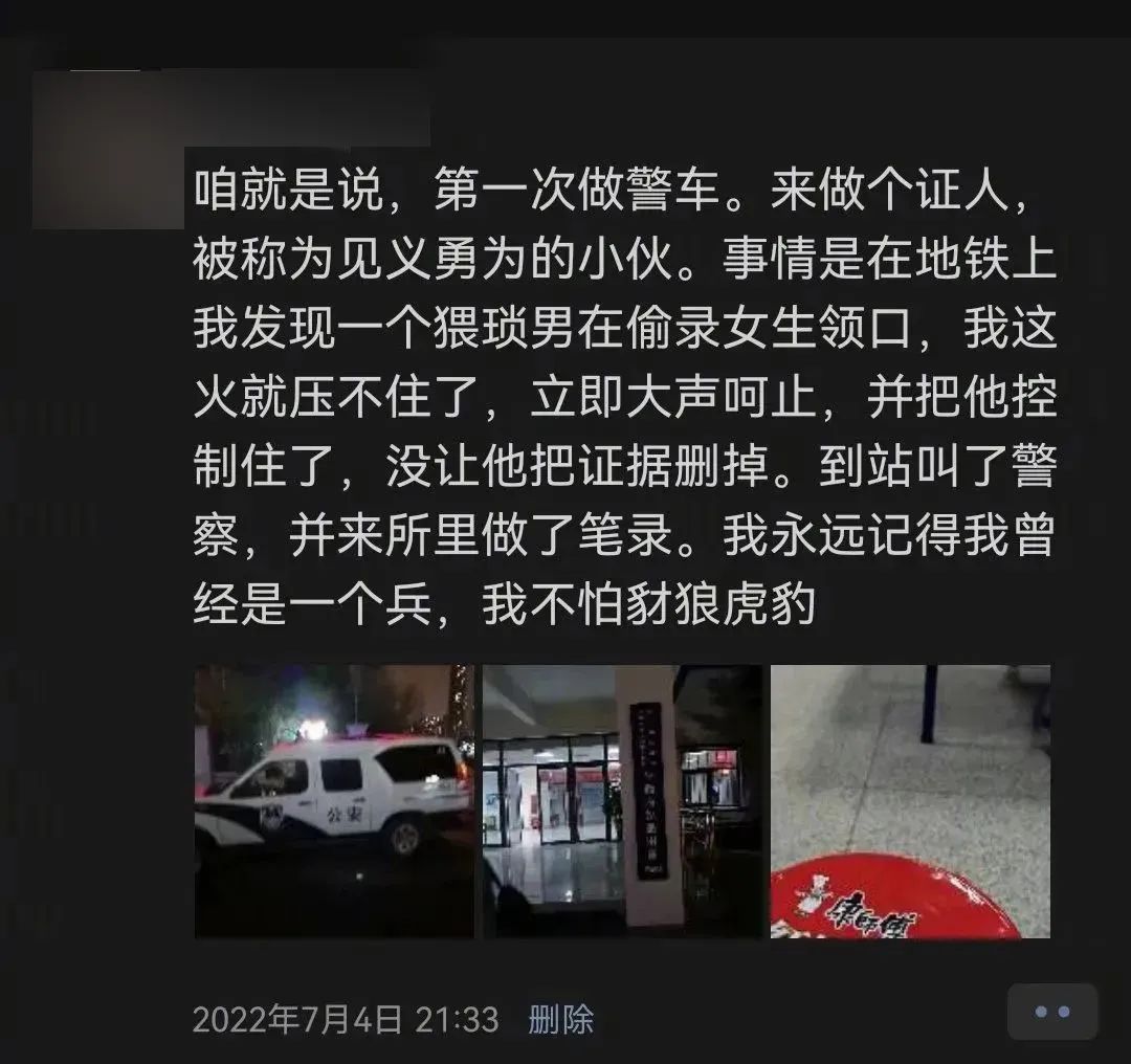 7月4日傍晚6点半左右,张明涵在北京8号线地铁上发现一名正在偷拍女乘客的男子。他毫不犹豫一声呵斥,见男子企图删除照片,张明涵赶忙拉住男子手臂,将存有证据的手机夺走,在两位好心大哥的帮助下制服了偷拍男子。下地铁后,张明涵请站台工作人员报了警,又跟随警察回到派出所,完成了后续的笔录等工作。