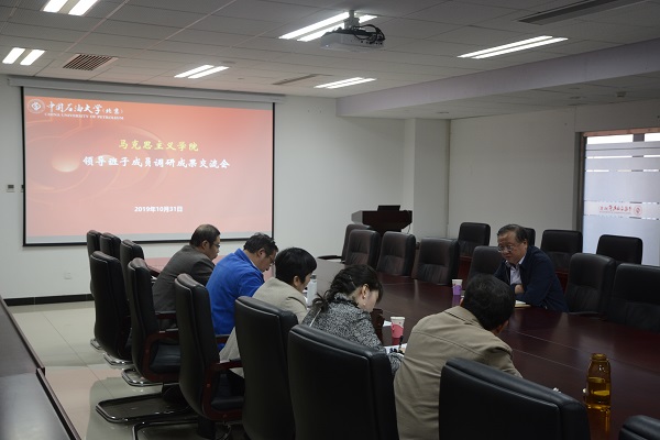 根据《中国石油大学(北京)“不忘初心、牢记使命”主题教育工作方案》要求,石大马克思主义学院领导班子围绕贯彻“守初心、担使命,找差距、抓落实”的总要求,紧密结合学院工作实际有序开展调研,把调查研究结果充分运用于学院工作各环节,大力推进主题教育见实效。10月31日下午,马克思主义学院召开“不忘初心、牢记使命”主题教育领导班子调研成果交流会。学校党委副书记雷玉江和学院领导班子全体成员参加会议,会议由学院党总支书记刘韵秋主持。