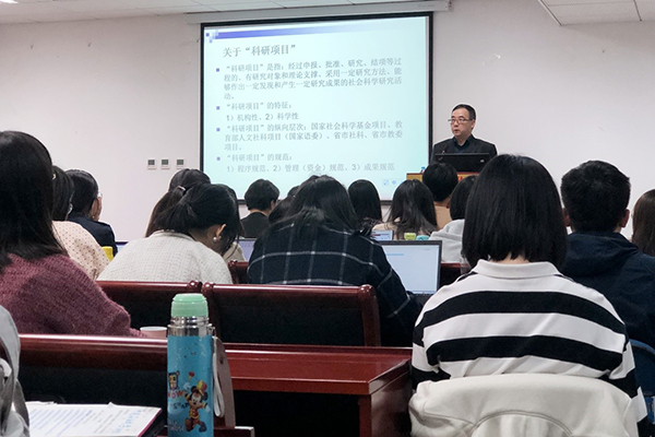 田海龙介绍了科研项目的定义与特征,结合生活事例重点阐述了科研项目申报书的写作原则,并对学院科研项目团队成员的项目申报书进行了指导。
