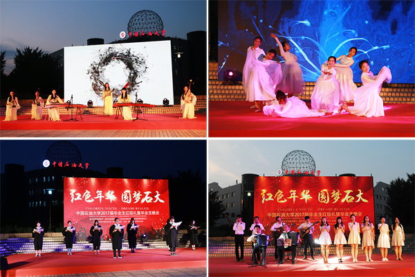 在毕业生晚会中,无论是小合唱《山楂树》,唯美的舞蹈《清清克拉玛依河》,还是民乐合奏《雨碎江南》,歌曲《一个人的北京》、《再见》,亦或是学生改编的石大版《成都》,毕业生创作的诗朗诵《昌平小事》,都表达了学生对母校的依依不舍之情。
