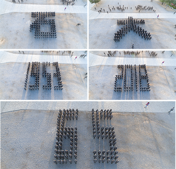 升国旗仪式后,军训团雄赳赳、气昂昂接受检阅,在分列式、军训训练成果汇报表演中,辅导员方队与15支学生方队口号嘹亮、步伐整齐地走过主席台,匕首操方队、军体拳方队、棍术方队表演了相应科目,拼图组字方队拼出“1953-2018”等字样献礼学校65周年校庆。