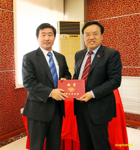 张来斌校长和姜锡肇总裁分别代表校企双方在意向书上签字。姜锡肇总裁受聘为我校兼职教授,张来斌校长为其颁发了兼职教授聘书。