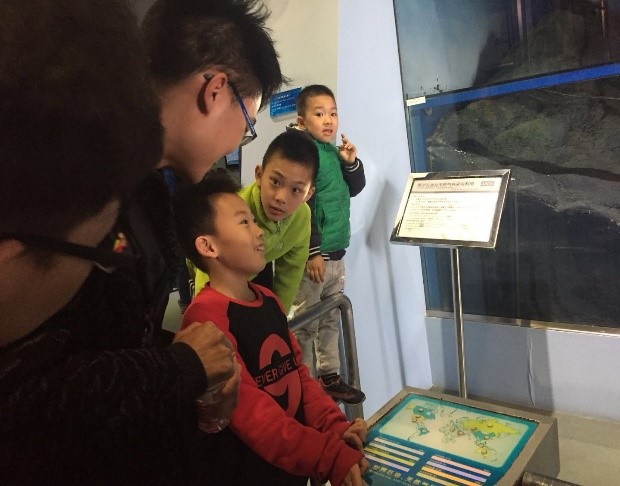 馆中还展览了能源革命、海洋开发等,我们时时停足观望,相互讨论。在海洋钻井平台展块,许多中小学生被海洋石油开采等装置所吸引,我们俯下身子把自己所学的专业知识分享给小学生们,即使蜻蜓点水般的讲解,孩子们依然听得津津有味。