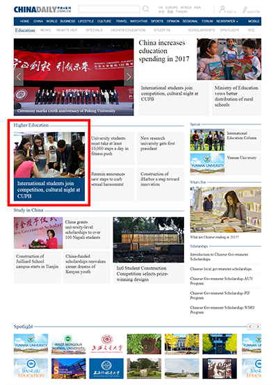 中国日报网(英文)Education频道首页以“International students join competition, cultural night at CUPB”