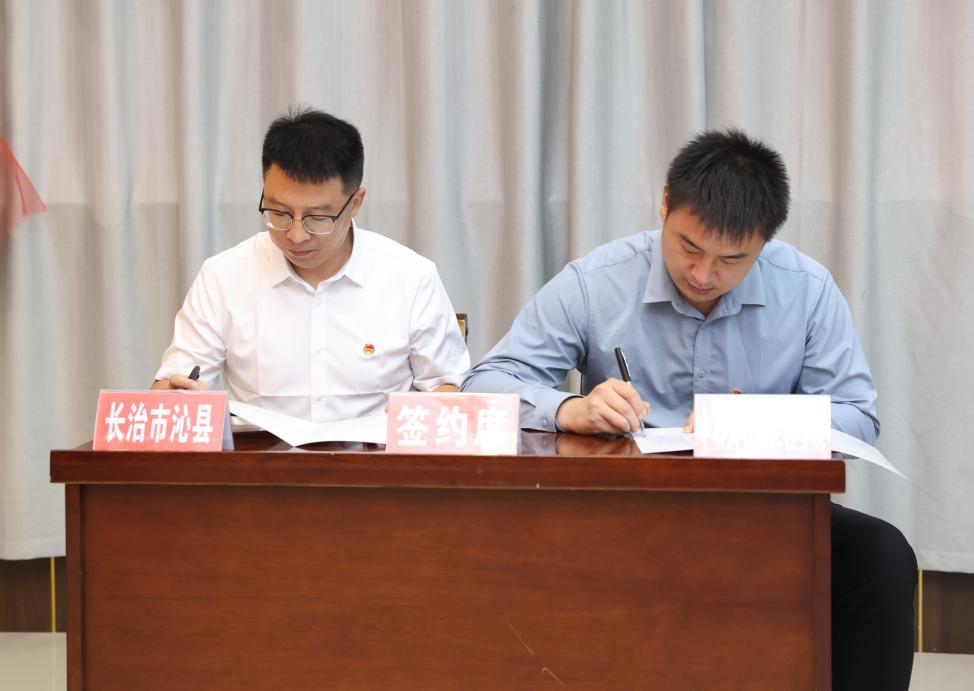 刘东东与沁县教育局局长卫杰就“省校合作”大学生实习实训基地签约并揭牌。