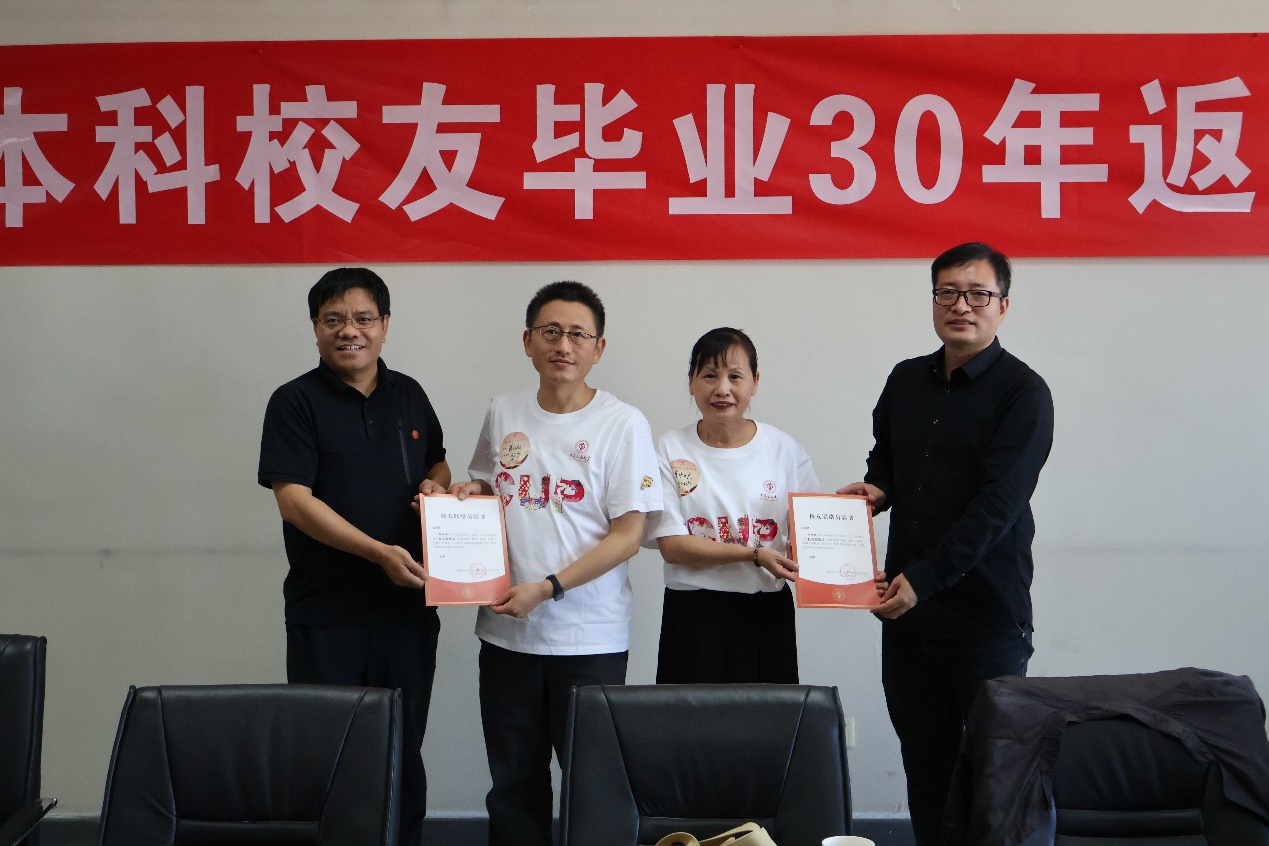 学院举行校友联络员聘任仪式,黄世军、宋先知为鲜成钢、肖中琼颁发校友联络员聘书。