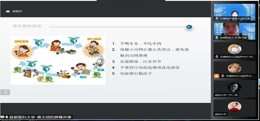 安澜微光生活安全宣教团团员、首都医科大学临床药学专业本科生蒋文硕就“医学进课堂,卫生护远航”进行了专题讲解。蒋文硕从后疫情时代常见疾病预防、用药安全常识和急救小知识三个方面,用简单明了而实用的内容,漫画等生动有趣的形式,向大家分享了医学知识。