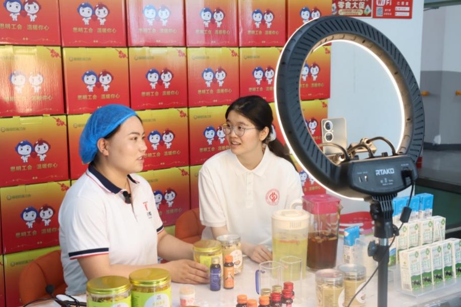 在闽宁禾美电商扶贫车间,有这样一支“巧媳妇”电商直播团队,她们的生活因电商直播蜕变。海燕作为“巧媳妇”电商直播团队的一员,带领实践团走进“巧媳妇”电商直播间,讲述“三只燕子”飞到“金沙滩”的动人故事。坐在直播间里,海燕幸福地回忆起电商直播带给她的“第一张银行卡”“第一次出远门”等诸多变化,实现了从山区田野到台前幕后的华丽蜕变。实践团了解到,80多位妇女在车间获得就业岗位,月收入可达2400至3500元,真正做到了“就业顾家两不误”。