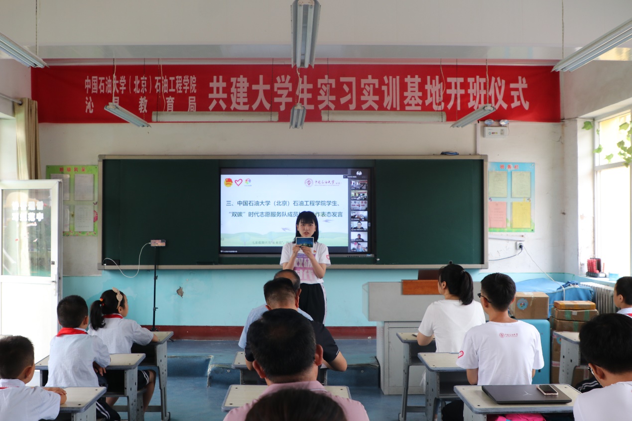 中石大石油工程学院2021级博士研究生、“双碳”时代志愿服务队成员林子愉作表态发言。她从中石大校训内涵讲起,讲述了一代代天游8线路检测中心子坚守的家国情怀,表示会将五彩斑斓的兴趣种子撒播在孩子们天真无邪的心田里,并希望看到种子生长出希望、自豪和骄傲,为实现国家现代化建设伟业和促进社会和谐进步做出贡献!