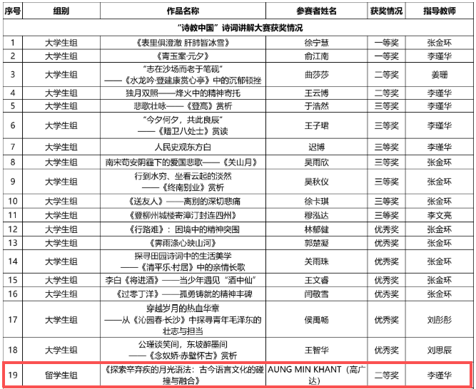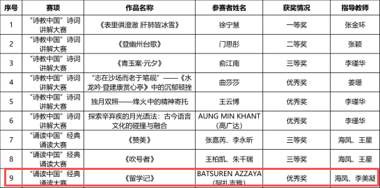 At the National Competition of the "Poetry Education in China" Poetry Lecture Contest, AUNG MIN KHANT, a 2023 bachelor student from Myanmar majoring in Mathematics and Applied Mathematics, won an Honorable Mention for his insightful interpretation and vivid presentation of classical Chinese poetry. At the same time, in the National Competition of the "Reciting China" Classic Reading Contest, BATSUREN AZZAYA, a 2023 bachelor student from Mongolia majoring in Marketing, also received an Honorable Mention for her emotionally expressive recitation of Chinese classics. These achievements fully demonstrate the outstanding results attained by our international students in learning and practicing Chinese language and culture. These accomplishments are not only personal honors but also vivid reflections of the International Education College's long-term commitment to promoting the international dissemination of China's fine traditional culture and deepening its "Chinese language + culture" educational model.