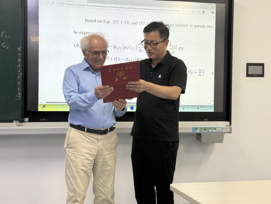 课程尾声迎来历史性时刻,石油工程学院宋先知院长和人事处刘悦副处长代表学校向Firoozabadi教授颁发了荣誉教授聘书,标志着校方与国际顶尖学者的深度合作正式启动。宋院长致辞说:“您三天来的倾囊相授,展现了热力学在能源领域的永恒价值。”刘处长也强调:“这份聘书不仅是仪式象征,还是连接国际创新成果与中国能源战略的桥梁。”Firoozabadi教授回应称期待与中国石油大学(北京)共同探索热力学研究的新思路新方向。此次聘任不仅是对Firoozabadi教授个人的崇高敬意,更是我校推进国际化战略、建设“双一流”学科的关键一步。