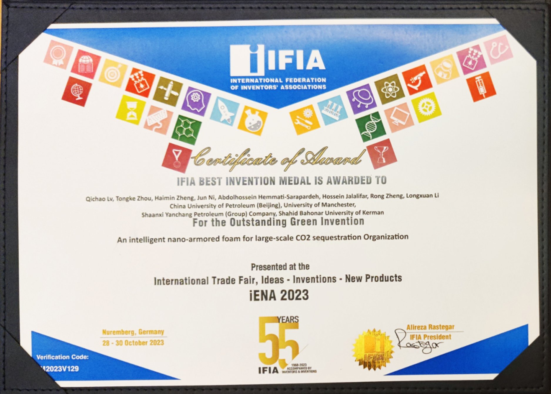 10月28日至30日,第75届德国纽伦堡国际发明展举办,来自全球30个国家和地区的500多项发明项目参展。实验室吕其超团队牵头,联合英国曼彻斯特大学、延长油田等单位科研人员共同完成的“智能纳米铠甲泡沫规模化封碳驱油技术”项目荣获德国纽伦堡国际发明展金奖。为表彰该成果在应对全球气候变化方面作出的创新贡献,国际发明者协会联合会(IFIA)授予该项成果最佳发明奖(本届仅2项)。
