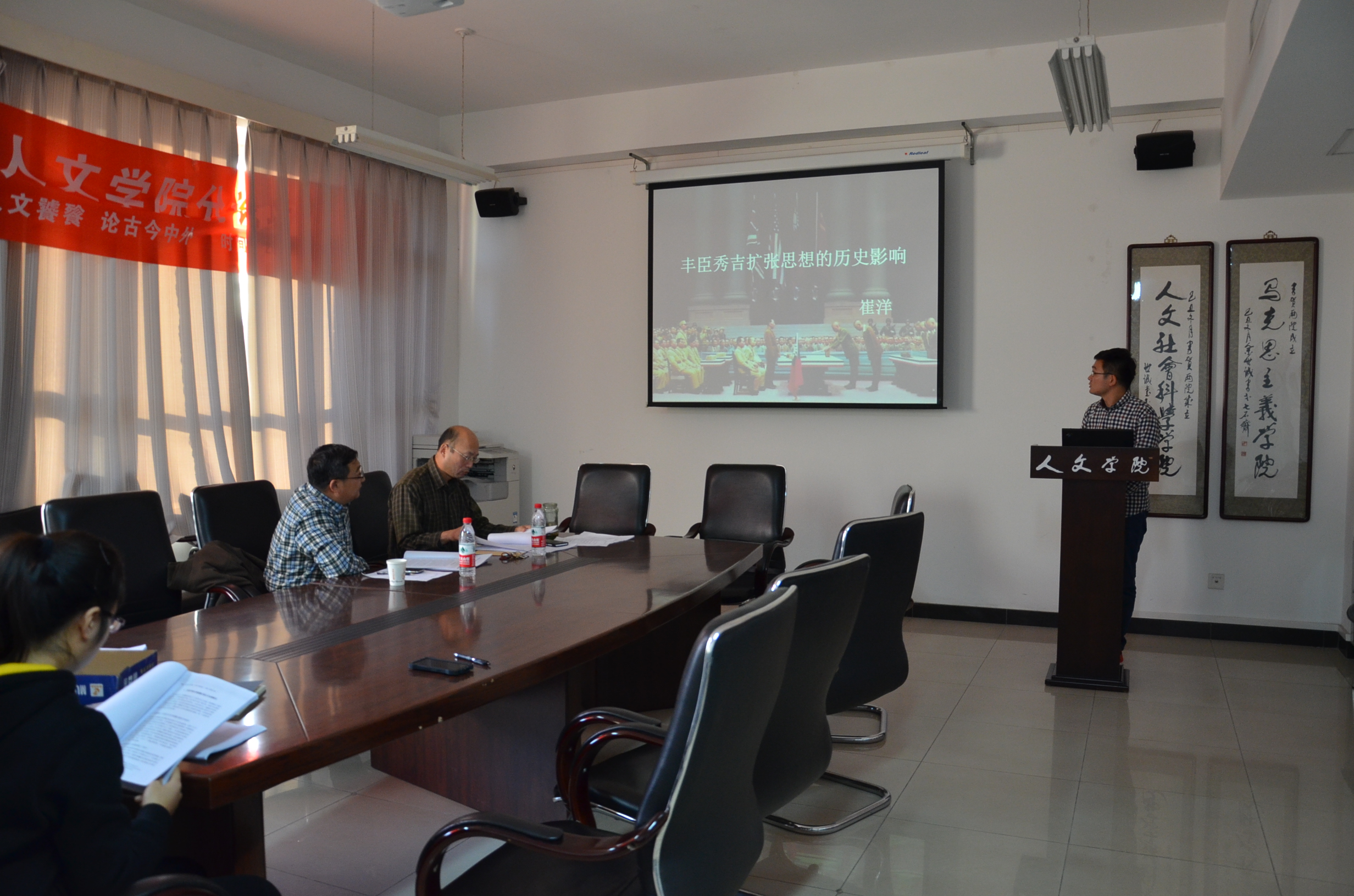 2014年11月21日下午14时30分,主题为“享人文饕餮,论古今中外”的中国石油大学(北京)学术论坛人文学院分论坛在中油大厦427会议室召开。刘韵秋老师与王鸣野老师作为评审老师参与了此次学术论坛。在此次学术论坛答辩活动中,我院杜录华、杨学诗、王爱景和崔洋等同学先后对自己的学术作品进行了阐述,刘韵秋老师与王鸣野老师都分别就各位同学论文和答辩过程中存在的不足进行了提问并给予了认真的点评。经过评审老师慎重的思考与讨论,最终将崔洋同学的《丰臣秀吉扩张思想的历史影响》推荐至校级学术论坛参与特、一、二等奖评选。王爱景同学的《浅析我国农村小学教学中的课堂公平问题》获得校级三等奖,杨学诗同学的《文化工业理论视角下耽美亚文化在我国流行的原因探析》与杜录华同学的《改革开放以来新疆分裂主义发展状况研究》获得院级一等奖。