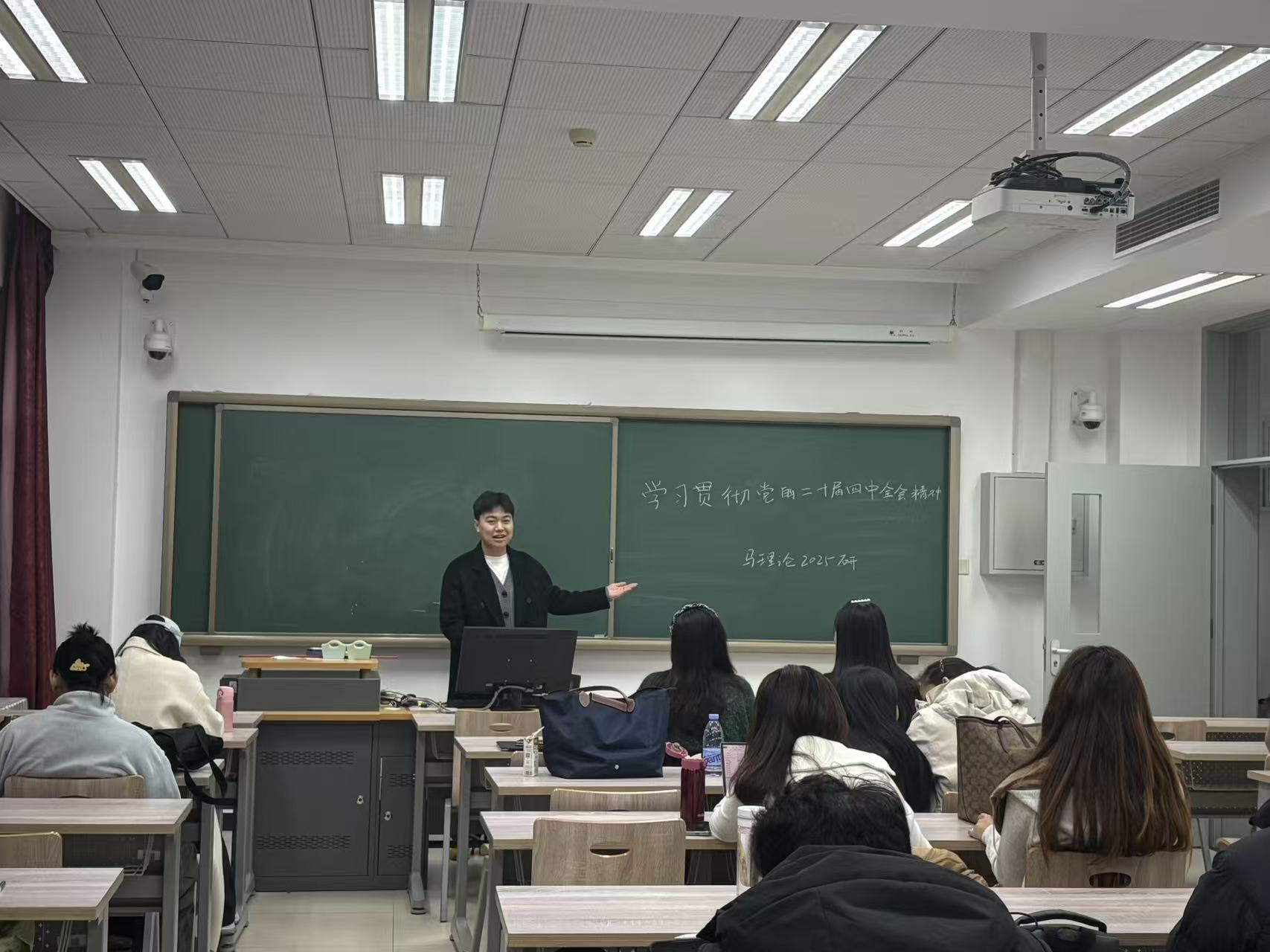 思政25-1班班主任姜林宏通过深入浅出的讲解,帮助学生们领会党的二十届四中全会重要决策对于国家发展和民族复兴的深远意义。他引导学生们深入思考“六个坚持”基本原则在专业学习中的实践内涵,以及如何将基本原则转化为推动个人成长和小我融入大我的实际行动。同学们纷纷表示要将专业学习与国家战略需求紧密结合学好专业知识,在学习中充分感悟思想政治教育专业的价值引领属性,坚定政治信仰、塑造担当意识和培养创新精神。