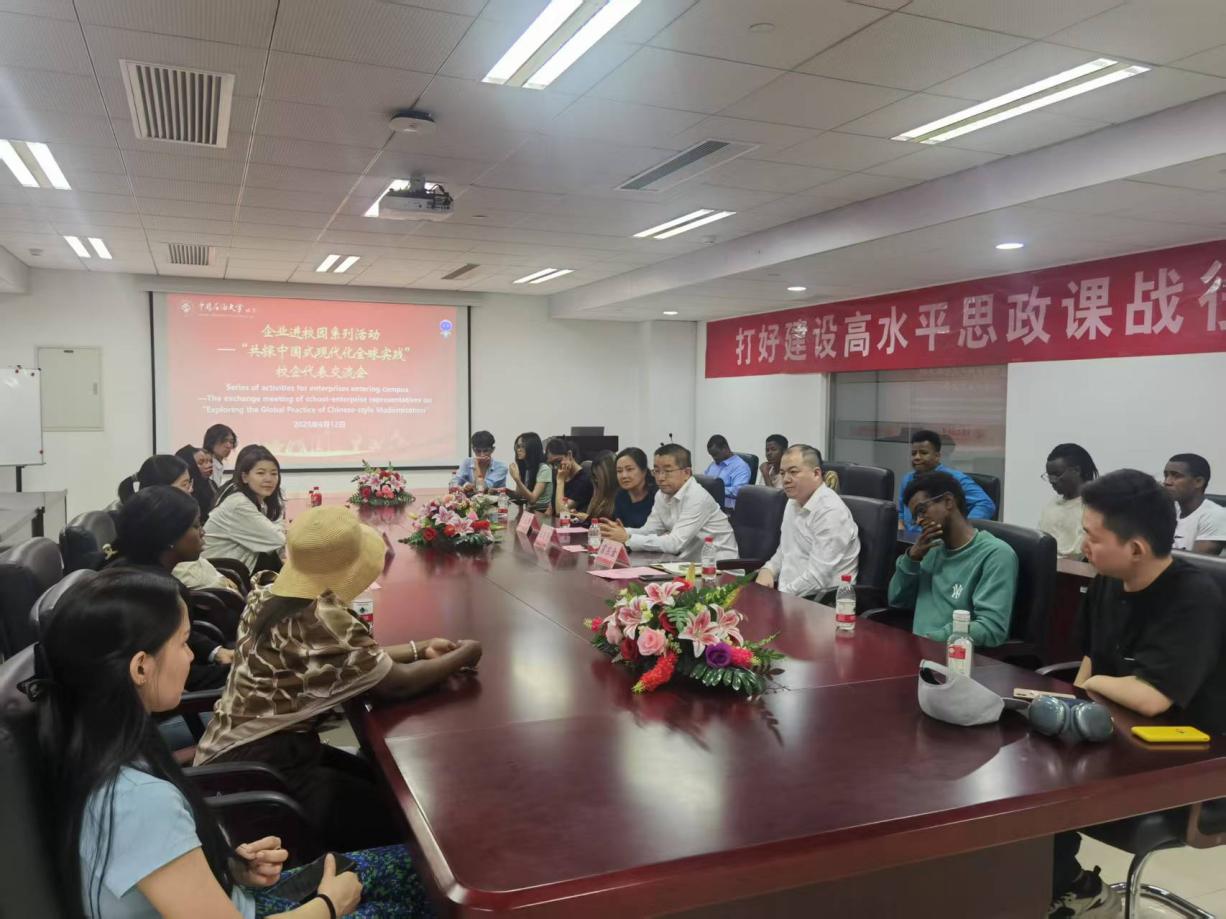 近日,由中石大国际教育学院与马克思主义学院联合主办的“企业进校园”系列活动之“共探中国式现代化全球实践”校企中外代表交流会在中石大举行。疆亘资本代表,马克思主义学院、国际教育学院教师,来华留学生通过实践分享与理论研讨,共话中国式现代化的全球实践路径。