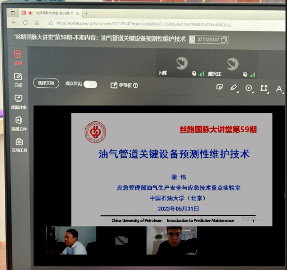 5月31日下午,第59期“丝路国脉大讲堂”邀请中国石油大学(北京)教授、应急管理部油气生产安全与应急技术重点实验室副主任梁伟讲授油气管道关键设备预测性维护技术。