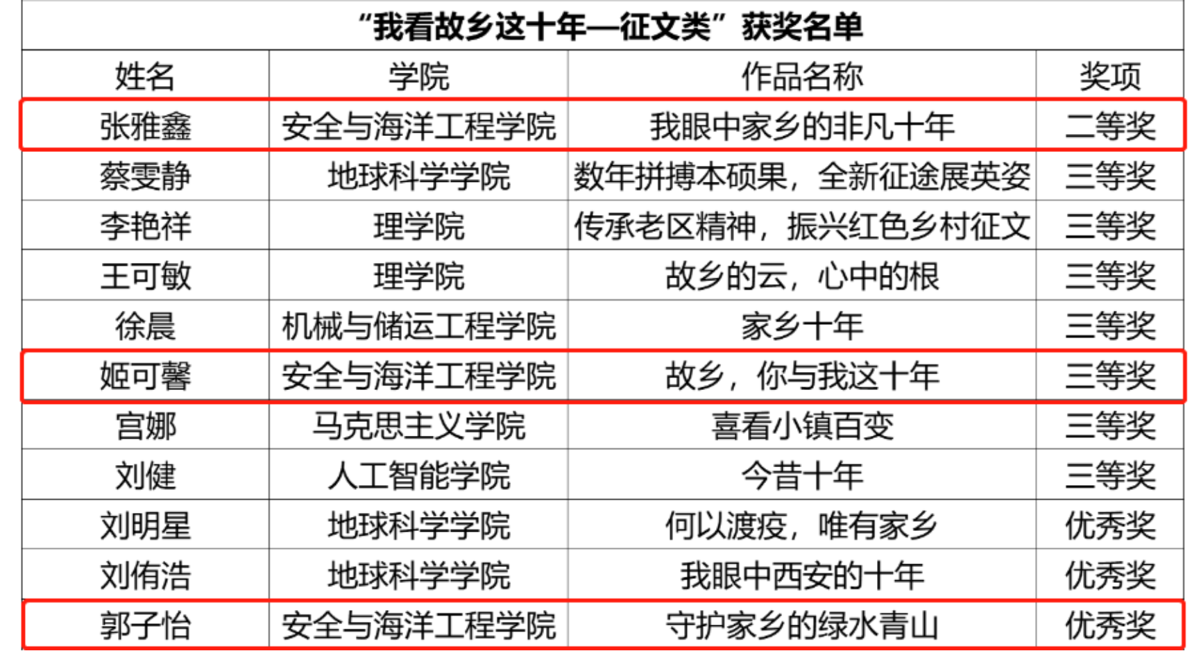 安全工程专业21级本科生张雅鑫、姬可馨、郭子怡分别获“我看故乡这十年-征文类”项目作品征集比赛二等奖、三等奖、优秀奖。