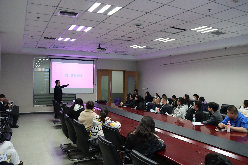 中建三局总承包公司校园招聘组马利恩介绍了公司的发展历程、荣誉奖项、工作地点、拓展领域、岗位需求、招聘流程及薪资福利待遇等,同时详细讲解了公司的北极星计划,并就毕业生们提出的问题一一进行耐心解答。会后,又为投递简历的同学们依次进行了一轮面试。