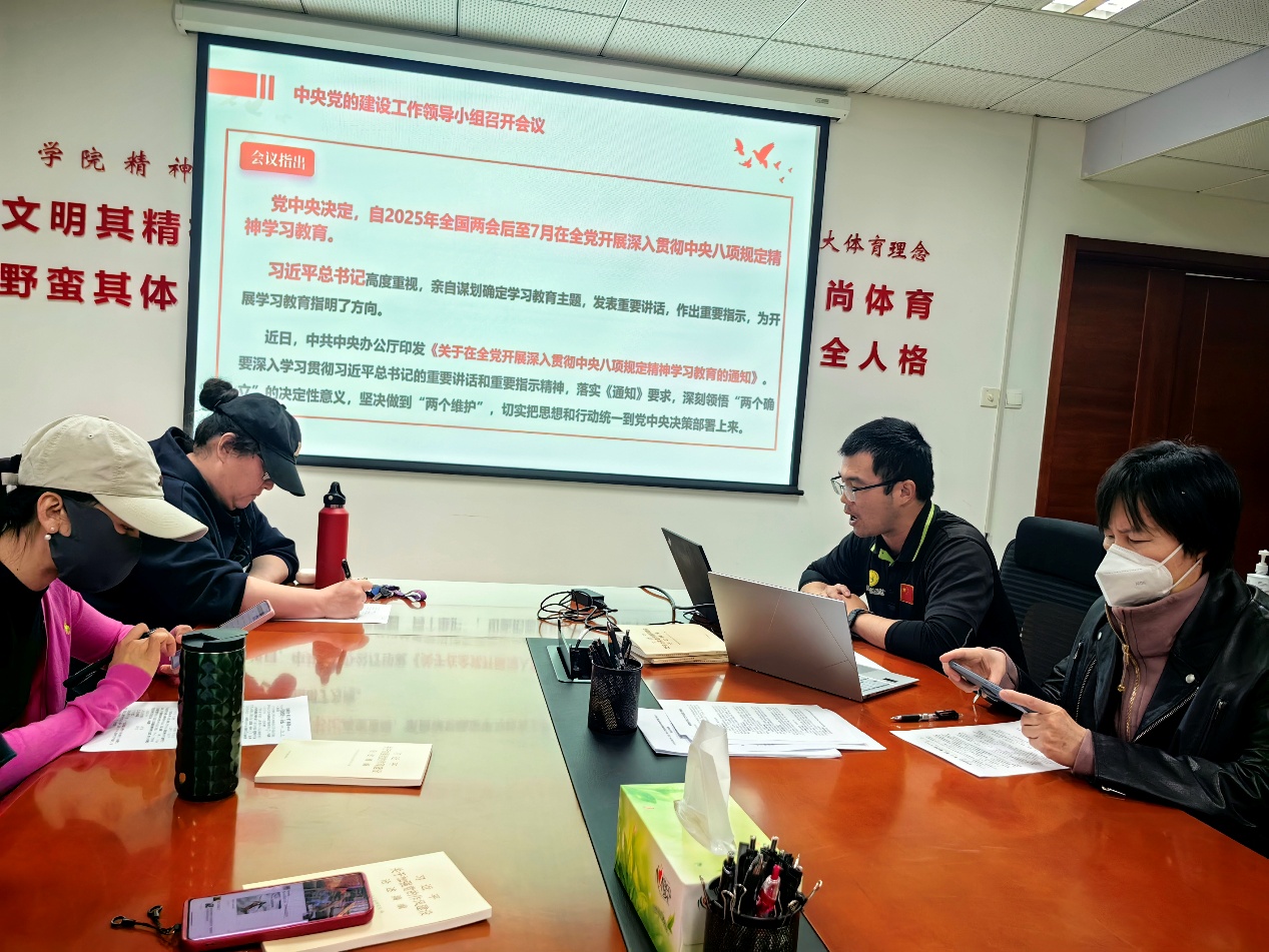 为推动深入贯彻中央八项规定精神学习教育走深走实,引导师生进一步统一思想、提高站位,以主动作为、勇于担当、马上落实的过硬作风,促进学校各项事业改革攻坚、取得突破,体育教研室教工党支部与环工本科生党支部和体育专业硕士研究生团支部于4月3日联合开展2025年4月份党支部组织生活和教职工政治理论学习。活动由体育教研室党支部书记尹彦主持,体育教研室全体教师、环工本科生党支部全体党员学生和体育专业硕士研究生团支部全体学生参加。