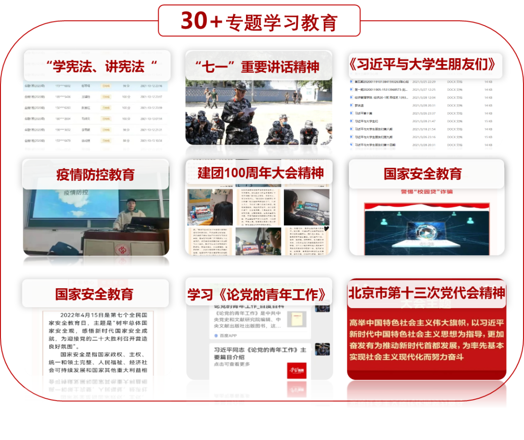 在团支部组织的思想学习活动方面,团支部共组织了30余次专题学习教育活动,主题丰富、形式多样。其中,包括对文章《论党的青年工作》的学习、对宪法内容的学习、对建团100周年大会精神的学习等,紧跟时事热点、结合生活实际是团支部每一次都能达到的效果。