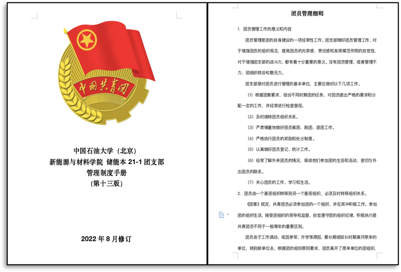 立足“机制建团、思想育团、实践活团、文化兴团”四大维度,针对团支部情况制定“特色中国石油大学(北京)储能本21-1团支部管理手册”,每月进行总结反思、及时更新,以此来不断增强基层团组织的自传能力,更好地服务青年。