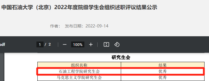 为党的二十大献礼--石油工程学院研究生会介绍:石油工程学院研究生会是在学院党委领导和学院团委指导下,以促进研究生全面发展为目标,以“代表和维护全体研究生利益,全心全意为全体研究生服务”为宗旨的研究生组织。26届石工研会共有成员34人,其中党员18人,积极分子11人。近日,在中国石油大学(北京)团委组织开展的2022年度院级学生会组织述职评议中,石工研会以研究生会组第一名的成绩,首次获得中国石油大学(北京)“优秀研究生会”称号。