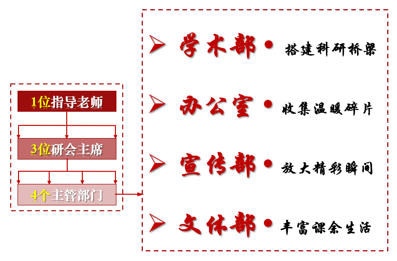 石工研会建立1位老师指导3位主席分管4个部门工作的“1+3+4”型组织管理模式,打造多方位、有特色的创新型学生组织。部门各司其职,相互协作,使学术与生活交融,科研与艺术邂逅,在热情与才华的碰撞中释放压力,推动研会各项工作顺利展开。