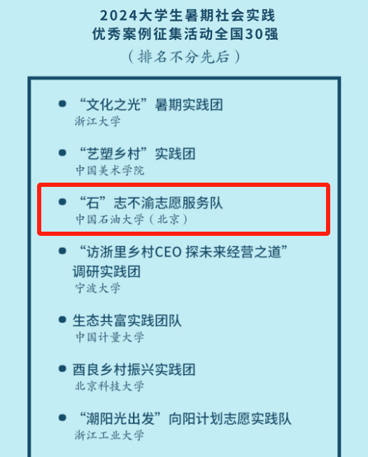 今年暑假,浙江日报潮新闻推出2024年大学生暑期社会实践优秀案例征集活动,共吸引全国近千支实践团队报名,通过团队自荐、材料审核、专家评审,评选出前30强优秀社会实践队伍。近日,评选结果揭晓,中国石油大学(北京)“石”志不渝志愿服务队入选。