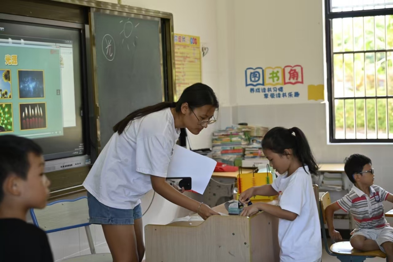 经济管理学院聚光琼州“支教+——做梦想之光的点亮者”实践团在阳江镇上科村上科小学辅导孩子