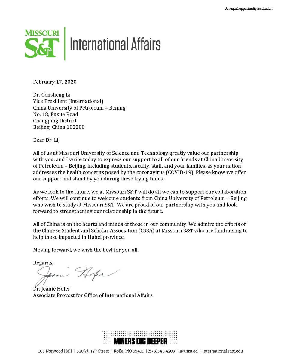 On February 17, Dr. Jeanie Hofer, Associate Vice President of the Missouri University of Science and Technology, expressed her condolences and support to all faculties and students and their family members of CUP. She said that “admire the efforts of the Chinese Student and Scholar Association (CSSA) at Missouri S&T who are fundraising to help those impacted in Hubei Province” and she looks forward to continuing to maintain a good cooperative relationship with CUP in the future. "